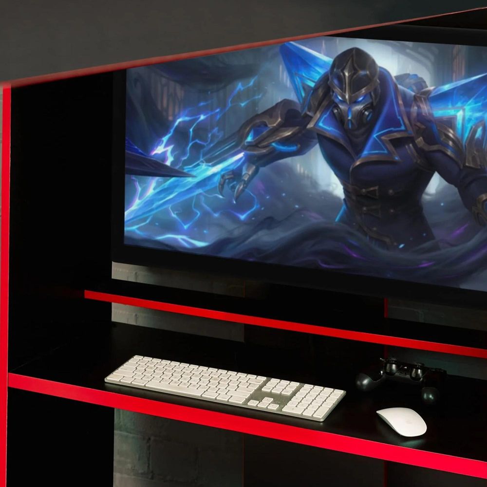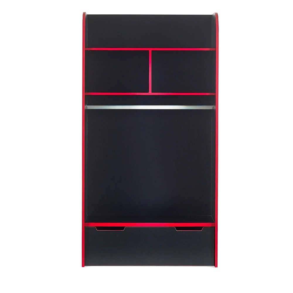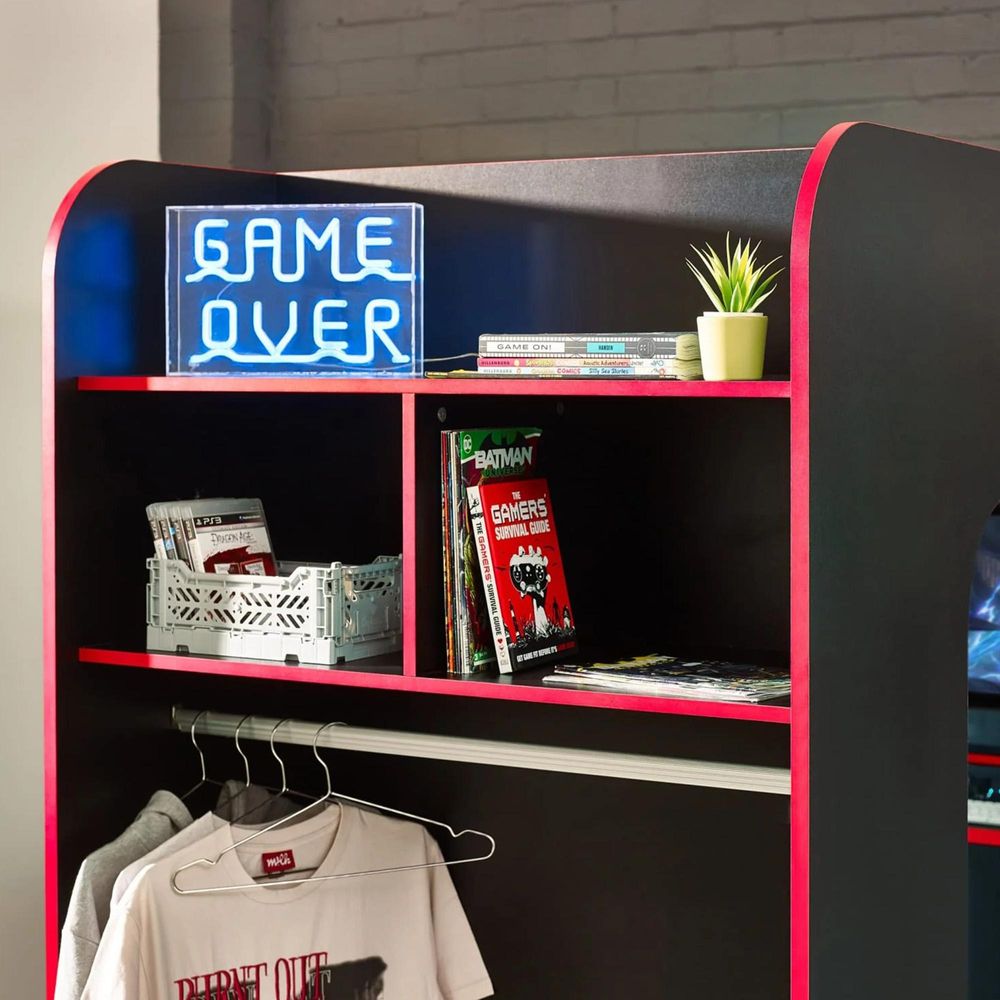 Item Code: IMP001 The Impact Gaming Bunk provides the perfect set up for teenage gamers, with a large underbed space and desk for a monitor. Featuring a hanging rail and multiple storage areas, this modern gaming bed provides the ideal space to sleep, play and stream. Available in Black/Red or All White.