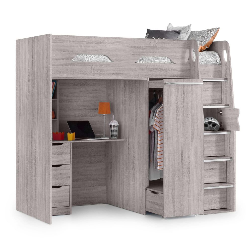 Item Code: PEG006 The Pegasus High Sleeper is the ultimate in functional bedroom furniture for kids and teenagers. Finished in a Grey Oak effect, Pegasus features an incredibly practical pull-out wardrobe with integral storage drawer, which really maximises the space available within its compact footprint. The robust desk includes further storage drawers and cable holes and there is ample headroom for even the tallest kids to work in comfort. The robust ladder includes further hidden handy storage cupboards at every step.