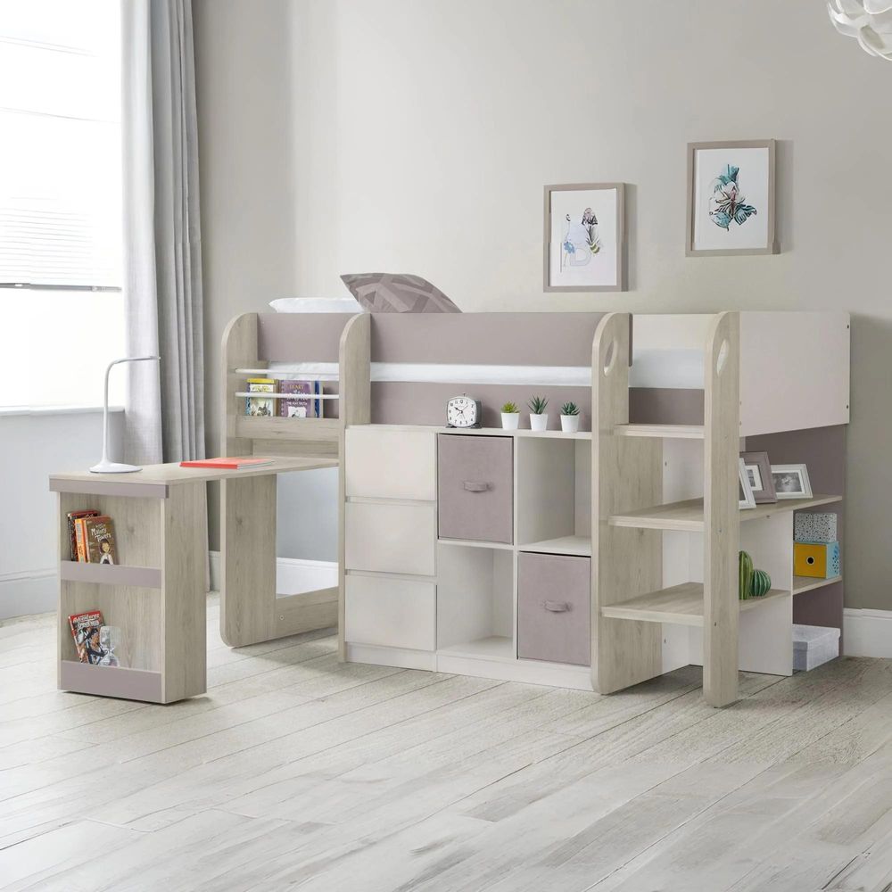 Item Code: SAT405 Maximise space with the Saturn Midsleeper, a compact solution featuring a built-in bookcase, a 3-drawer chest, and a cube bookcase. Ideal for saving floor space and organising toys. Finished in a modern taupe and white, it seamlessly complements various children's bedroom decors. Crafted from sturdy particleboard, the bed includes a wooden slatted base and accommodates a UK single mattress.