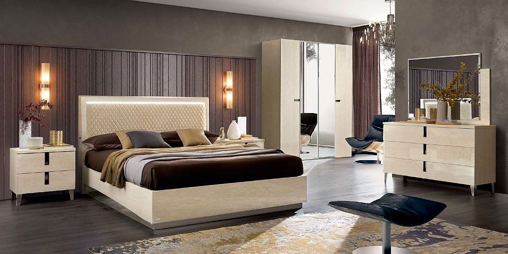 Item Code: 148LET.15AV/000RET.184O Shining surfaces and harmonious contrasts between the chiaroscuro of the birch and the depth of Black Nickel details are the leit-motif of Ambra collection.Headboard: Rhomb-shaped padding in diamond quilted and stitching on eco nabuk material. Led lights 110-250v on aluminum profile and satin opal screen.Plinths: 18mm thick MDF in fabric looking finish on internal side and in nickel black finish on external side.Hardware