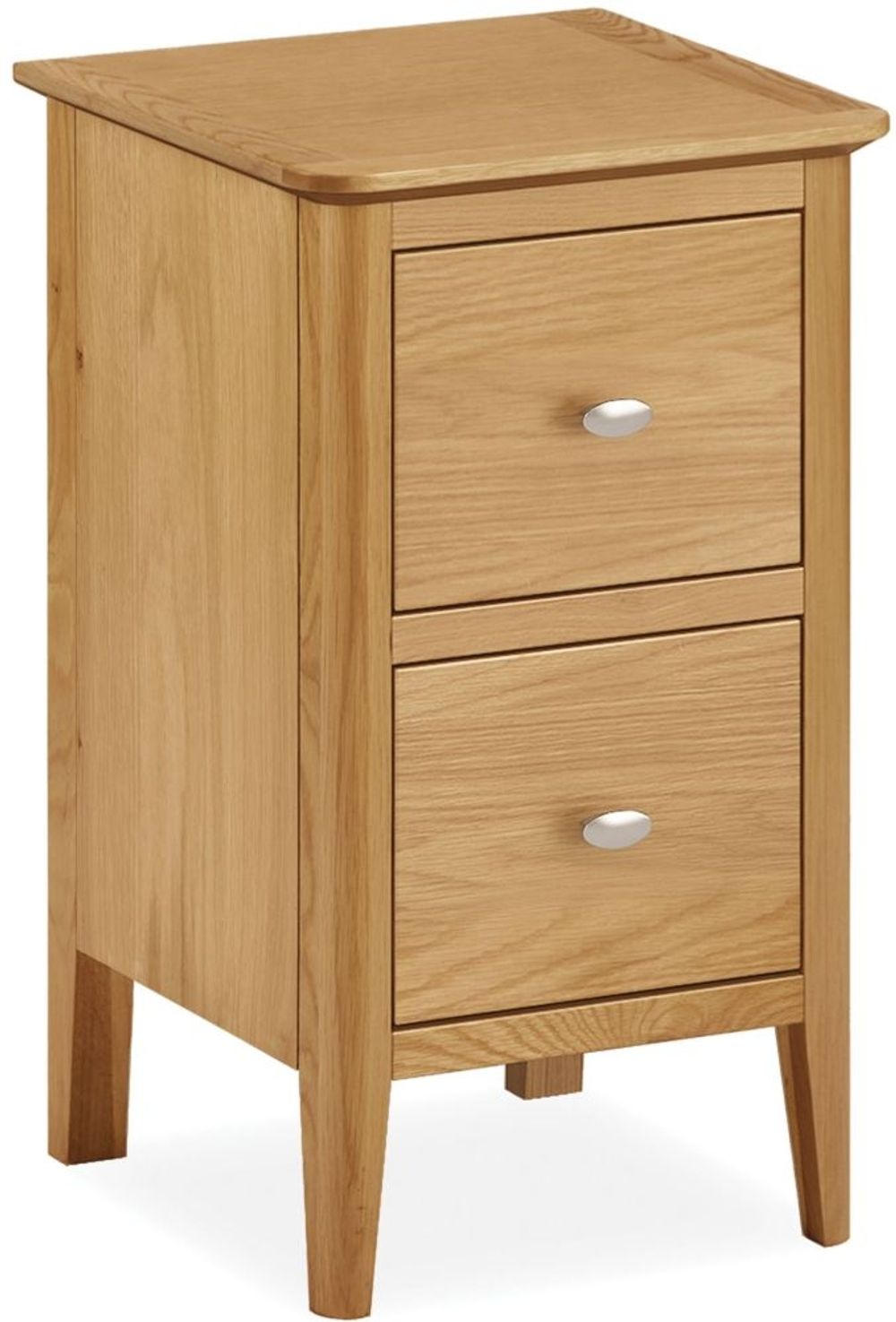 Perfect for compact spaces, the Bath Oak 2 Drawer Narrow Bedside Cabinet combines timeless style with everyday functionality. Crafted from pale oak and finished with a light lacquer, the natural beauty of the wood grain is enhanced, while the contemporary tapered legs and rounded edges bring a refined finish to the design.