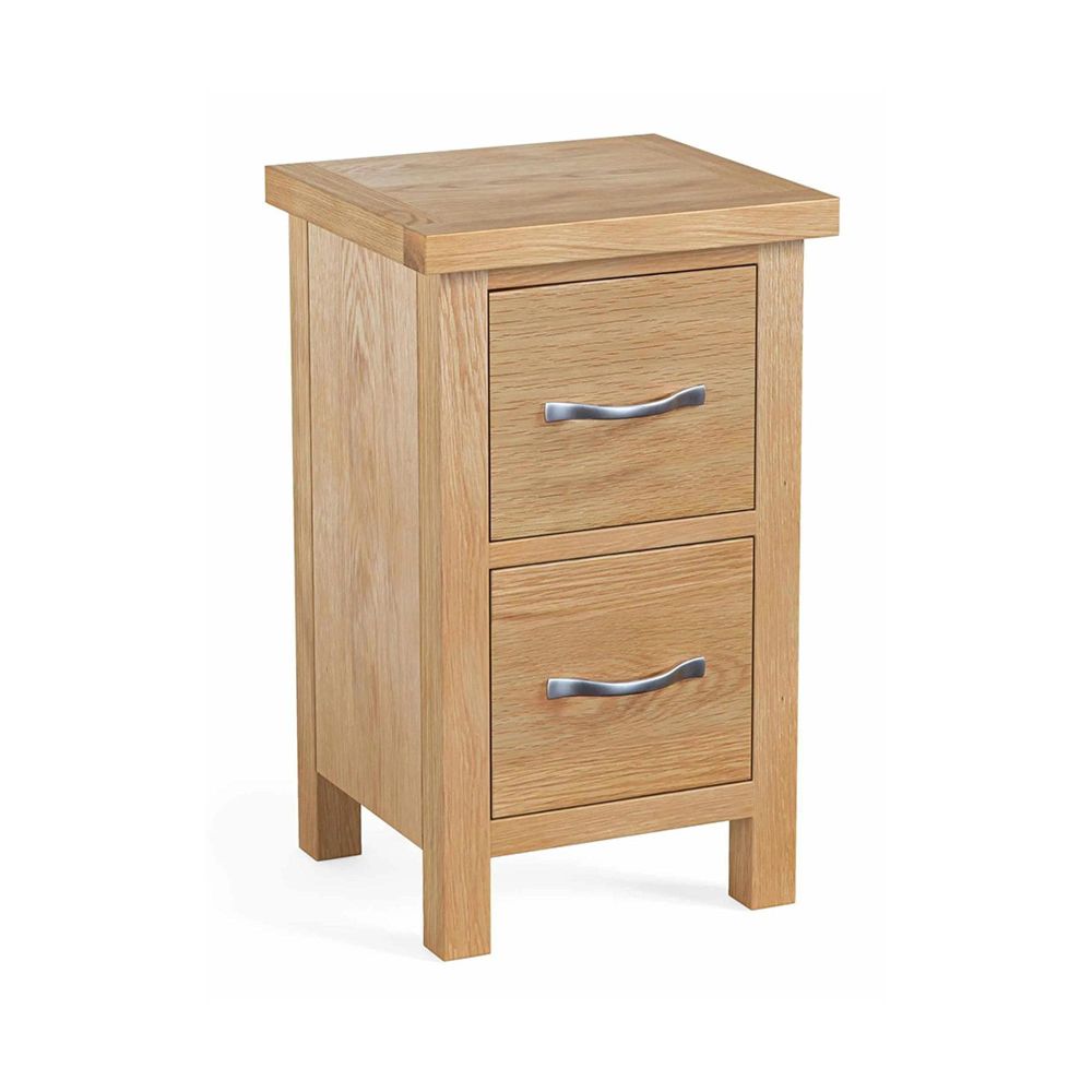 Bring function and style together with the New Trinity Natural Oak Narrow 2 Drawer Bedside Cabinet. Choose this cabinet today and enjoy the quality, craftsmanship, and timeless appeal it adds to your bedroom.