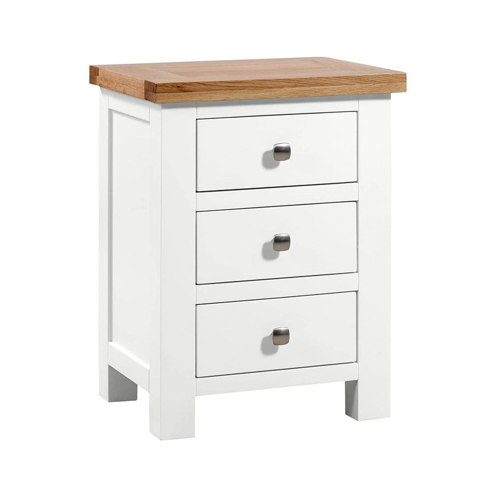 The Lundy White Painted 3 Drawer Bedside Cabinet is a perfect blend of style, durability, and practicality. With its fresh white painted finish and contrasting light oak lacquered top, this bedside cabinet brings a touch of timeless charm to any bedroom. Designed with three spacious drawers, it provides ample storage while maintaining a sleek and elegant profile.