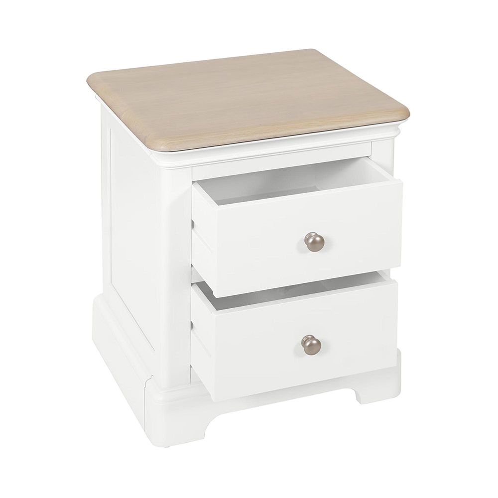 The Cromwell White Painted 2 Drawer Bedside Cabinet combines timeless design with practical function, offering a refined storage solution for the modern bedroom. Crafted from a blend of white oak, pine, and MDF, this piece showcases durability as well as beauty. Its white painted body is complemented by a lightly lacquered solid oak top, creating a neutral and light-toned finish that works seamlessly with both traditional and modern interiors.