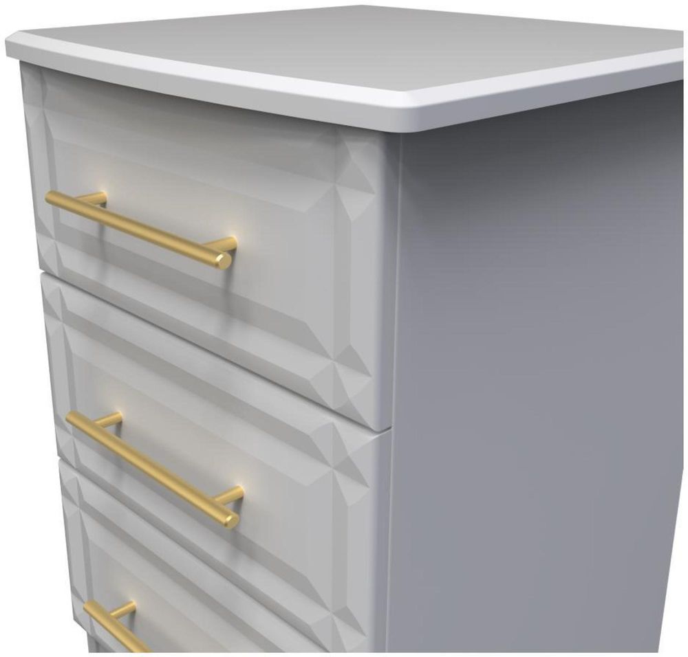 • Carcass: 18mm MFC furniture board, with ABS edging tapes (2mm)• Front: 18mm MDF , HTV Vinyl wrapped. With 2 mm edge. Routed pattern.• Construction: Glued, dowelled and screwed. Metal KD fixings, castors wheel• Handle: (Sherwood) metal ?T? bar, gold coloured bar. 235mm / 535mm• Drawer:18mm MFC, HTV Vinyl wrapped . 3mm hardboard base, chipboard wrap with a 15mm wall. Soft close.• Top: 18mm MDF, HTV Vinyl Wrapped• Drawer Runner: Soft close York runner