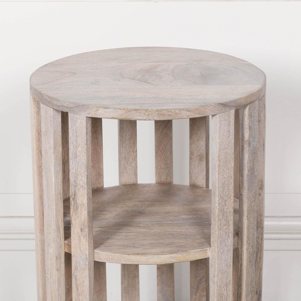 Item Code: KFA455 Wooden Mango slated bedside with lower storage shelf. The bedside is made from Mango wood with a Blanchie washing to achieve a pale wood colour tone.
