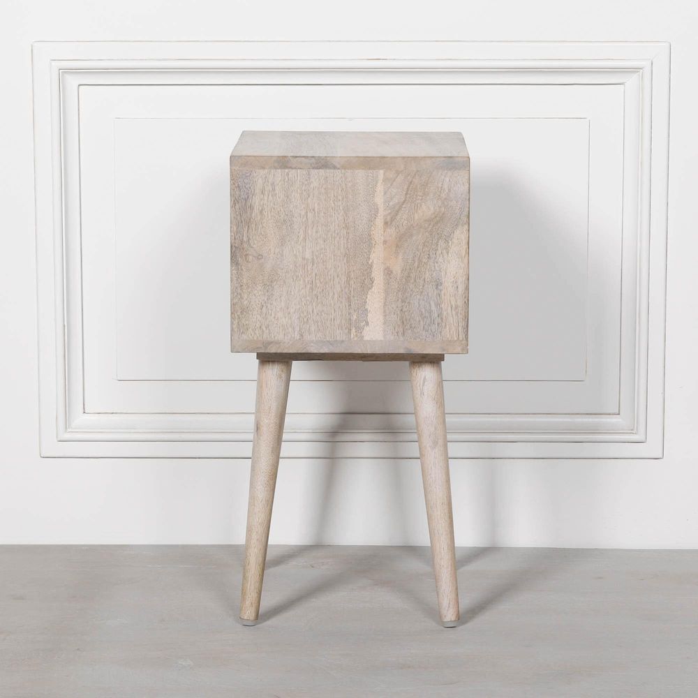 Item Code: KFA919 Wooden Mango bedside with lower storage shelf in a modern design. The bedside is made from Mango wood with a Blanchie washing to achieve a pale wood colour tone.