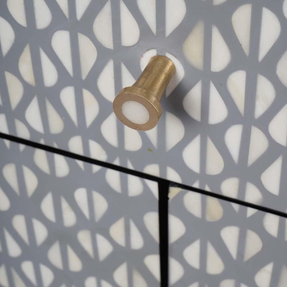Item Code: 706207 The Burgess Bone Inlay Two Door & One Drawer Bedside is a masterfully crafted piece that effortlessly blends contemporary design with traditional craftsmanship. Adorned with meticulously hand applied bone inlay, its intricate pattern in grey and white tones takes centre stage. The subtle antique brass finished handles are thoughtfully integrated, enhancing the design without overshadowing the cabinet's beauty. Supported by slender, antique brass finish metal legs, this stylish nightstand offers both elegance and practicality. Ideal for those who appreciate the fusion of modern style with artisan crafted furniture, the Burgess Bedside is a striking addition to any bedroom, hallway, or lounge. Part of the Burgess collection, which includes a Three Door Sideboard.