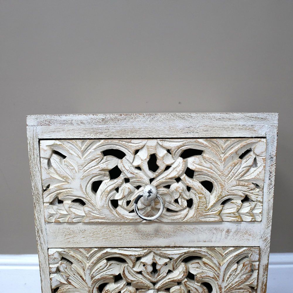 Bedside Cabinet - 2 Drawer - Distressed White Carved Mango Wood