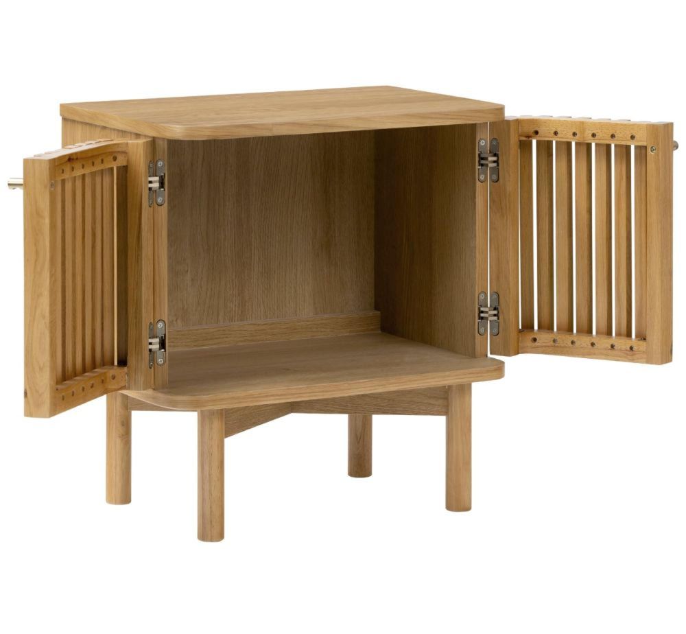 The defining feature of this bedside table is its slatted door design, which adds texture and visual depth without overwhelming the space. Clean lines, soft curves, and cylindrical legs with cross support create a balanced silhouette that blends seamlessly into any bedroom setting. Behind the twin slatted doors, generous storage space keeps your bedside essentials neatly organised, maintaining a clutter-free look that feels calm and considered. The Soho Oak Bedside Table brings both function and design harmony to your bedroom. Its compact yet substantial build, thoughtful detailing, and elegant oak finish make it a timeless companion piece for any sleeping space.