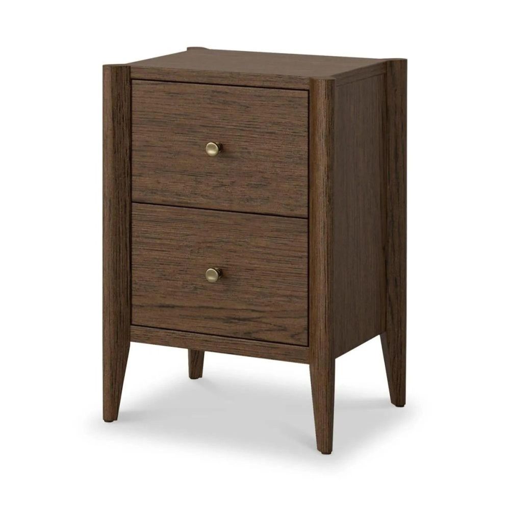 The two smooth-gliding drawers with subtle brass handles provide easy-access storage for personal items, books, or nightly essentials. Tapered legs and clean, minimalist lines give it a sophisticated Mid-Century inspired aesthetic, while the natural oak or rich dark oak finish ensures it complements a wide range of bedroom furniture.
