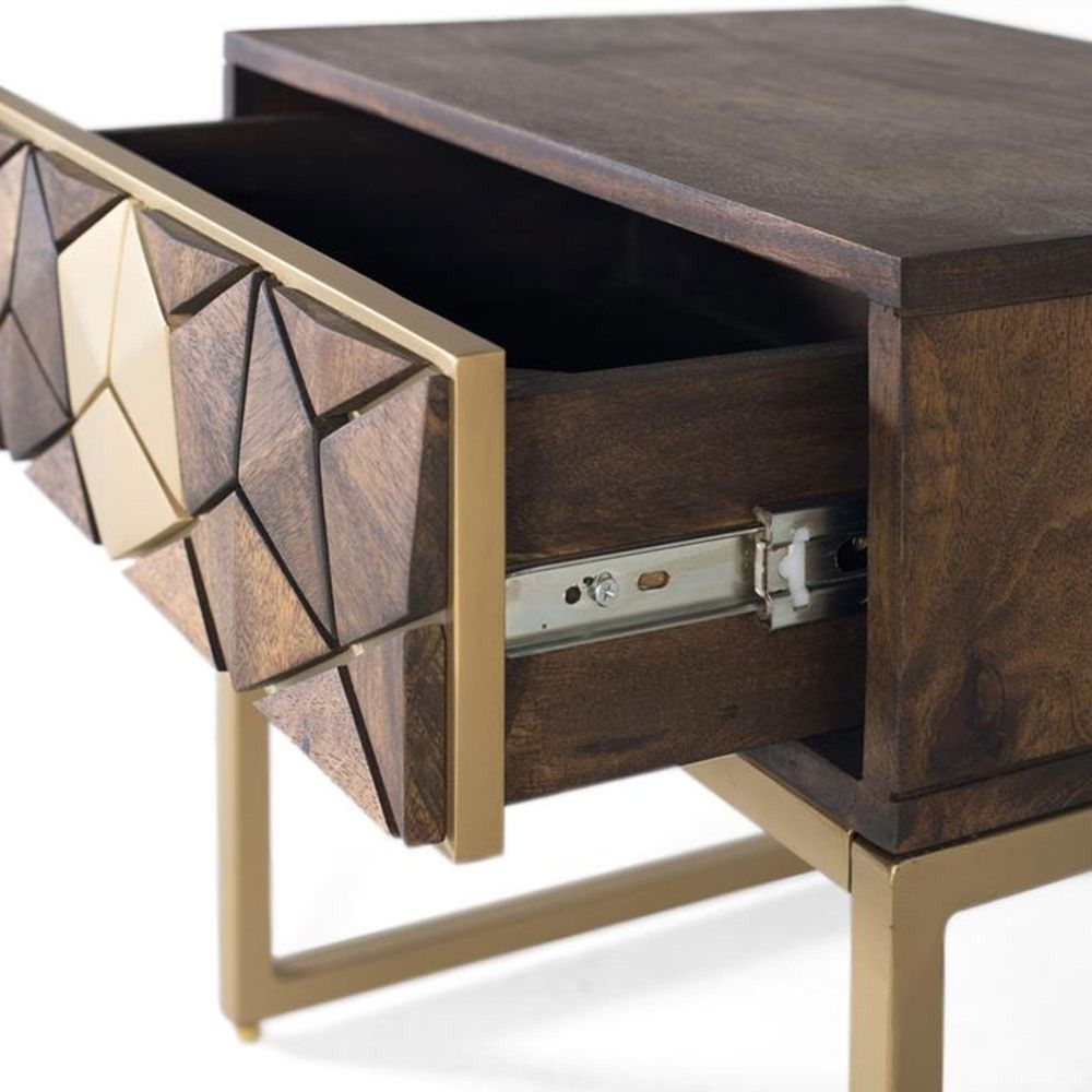 Caltan Bedside Table - 1 Drawer - Walnut Mango Wood and Gold - Geometric