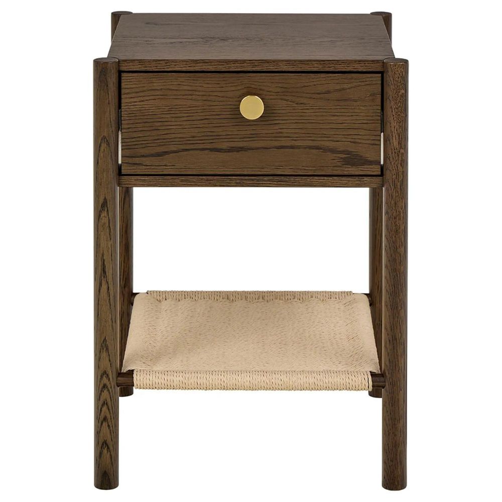 Monfort square/rectangular bedside table, top smoked PU lacquered oak veneer, frame and drawer smoked NC lacquered oak veneer, shelf off white paper plaits, base smoked NC lacquered oak, 43.5x40x60 cmInspired by nature's diversity, this bedside table blends diverse earthy elements, evoking a tranquil atmosphere. Made with smoked lacquered oak and off-white paper plaits, the table is designed with a drawer and a shelf for storing small essentials.