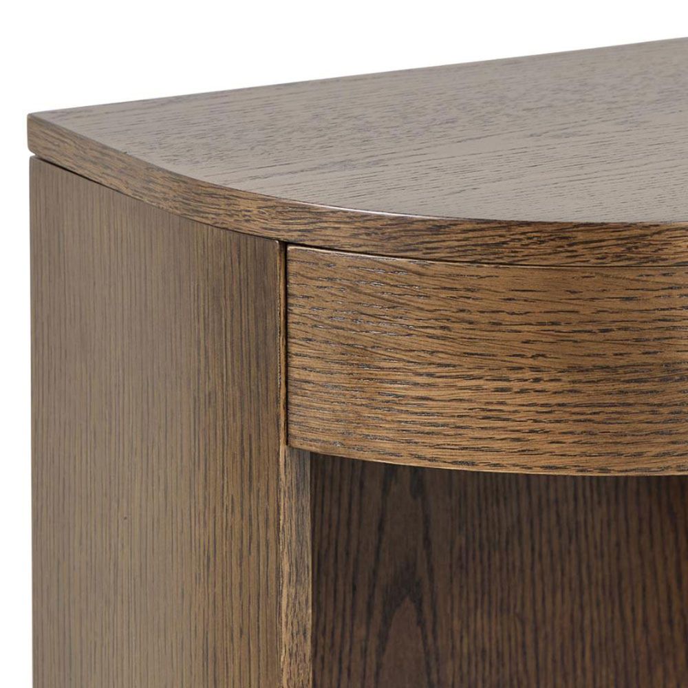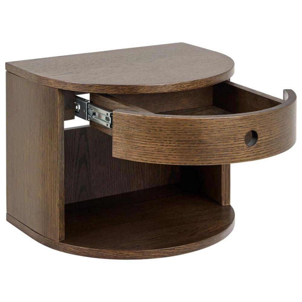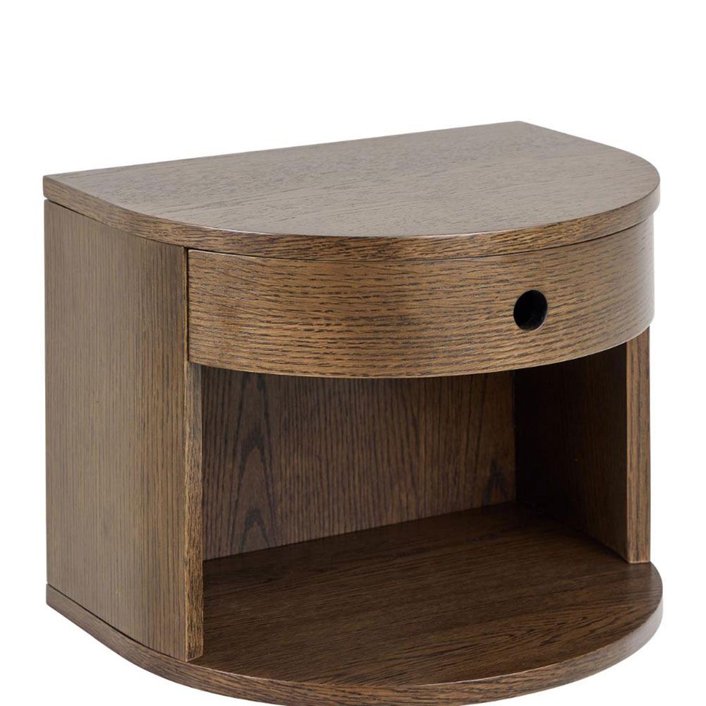 Paron semicircle bedside table, top smoked PU lacquered oak veneer, frame and drawer smoked NC lacquered oak veneer with open compartment and wall mounting, 40x31.5x30 cmThis wall-mounted bedside table stands out for its semi-circled form. Featuring a drawer and open compartment, it can hold small essentials. Its smoked lacquered oak veneer highlights the table's design, accentuating its natural look.