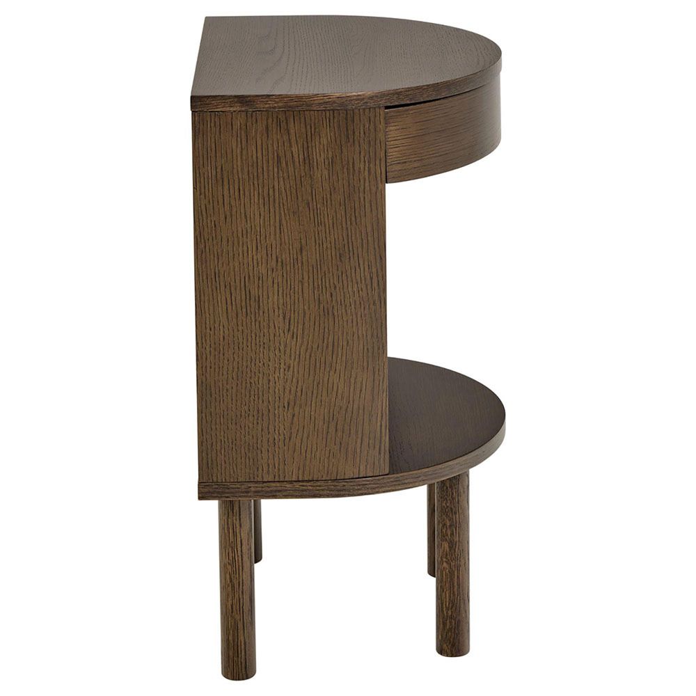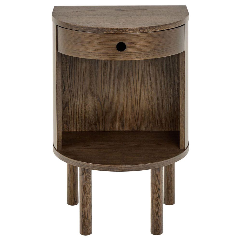 Paron semicircle bedside table, top smoked PU lacquered oak veneer, frame and drawer smoked NC lacquered oak veneer, base smoked NC lacquered oak with open compartment, 40x31.5x60 cmThis bedside table stands out for its chic aesthetic, boasting a semi-circled form and round legs. Featuring a drawer and open compartment, it can hold small essentials and decor. Its smoked lacquered oak veneer highlights the table's design, accentuating its natural look.