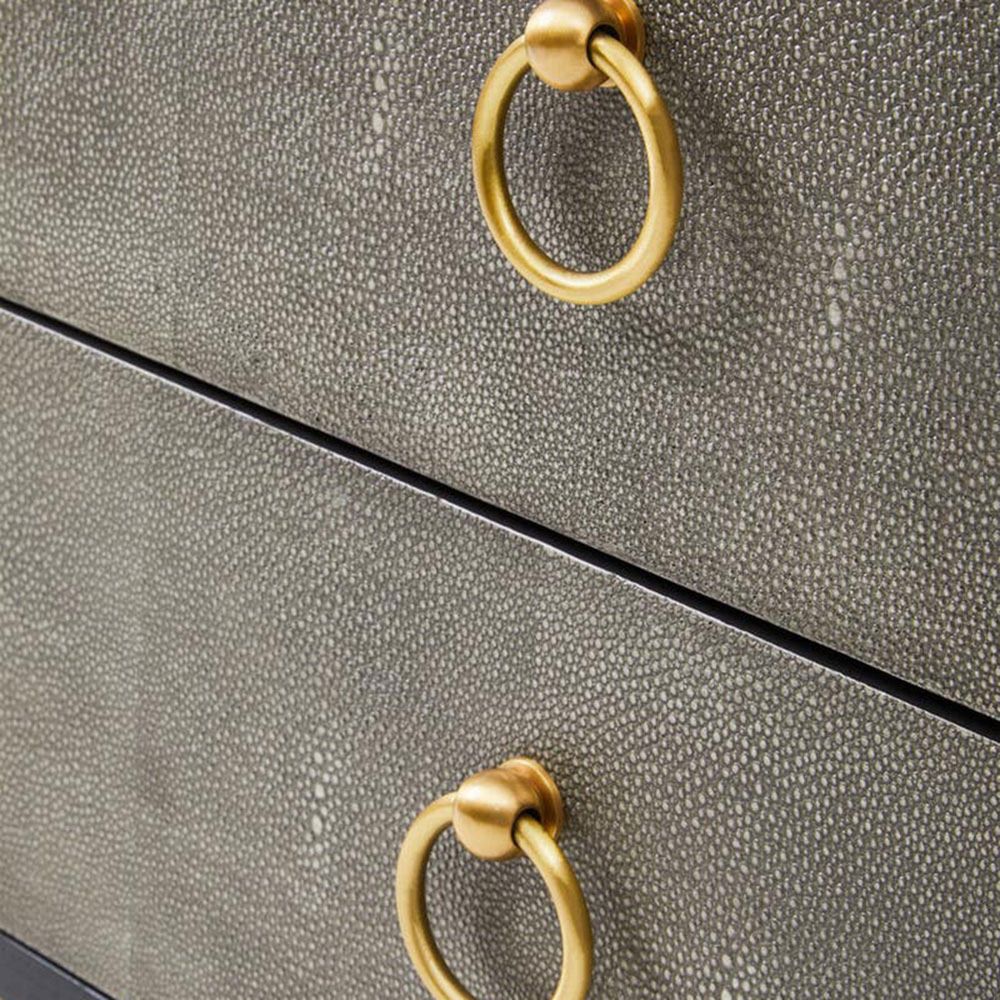 Item Code: 5529248 The Deruta grey shagreen effect side table features a sophisticated, textured design complemented by gold ring handles and a stylish metallic base.