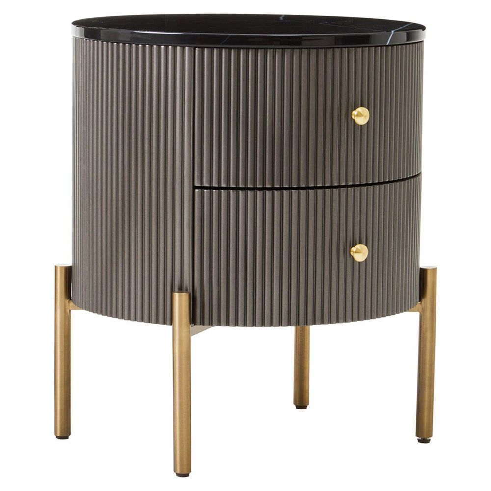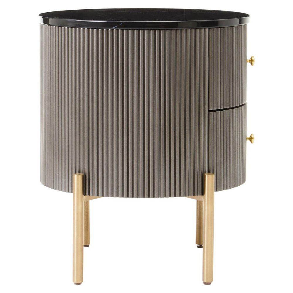 Dervio Bedside Cabinet - 2 Drawer - Round - Grey Fluted with Black Marble Top