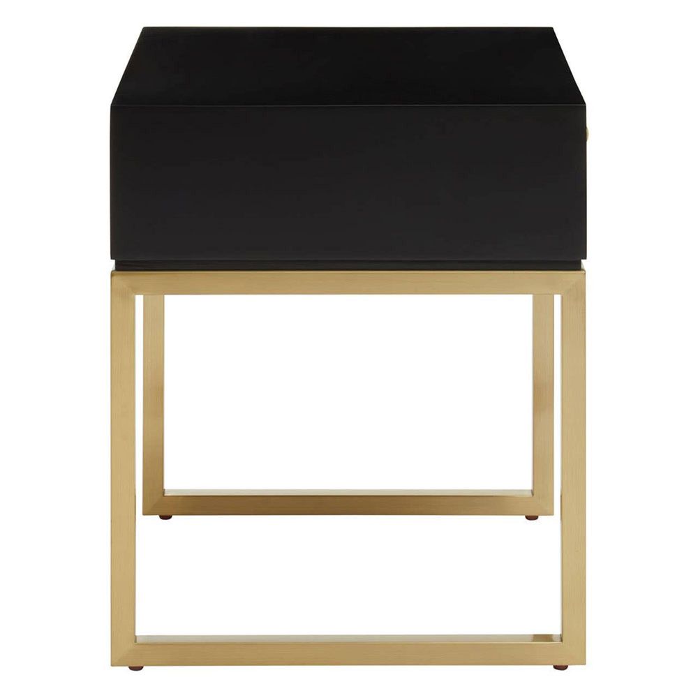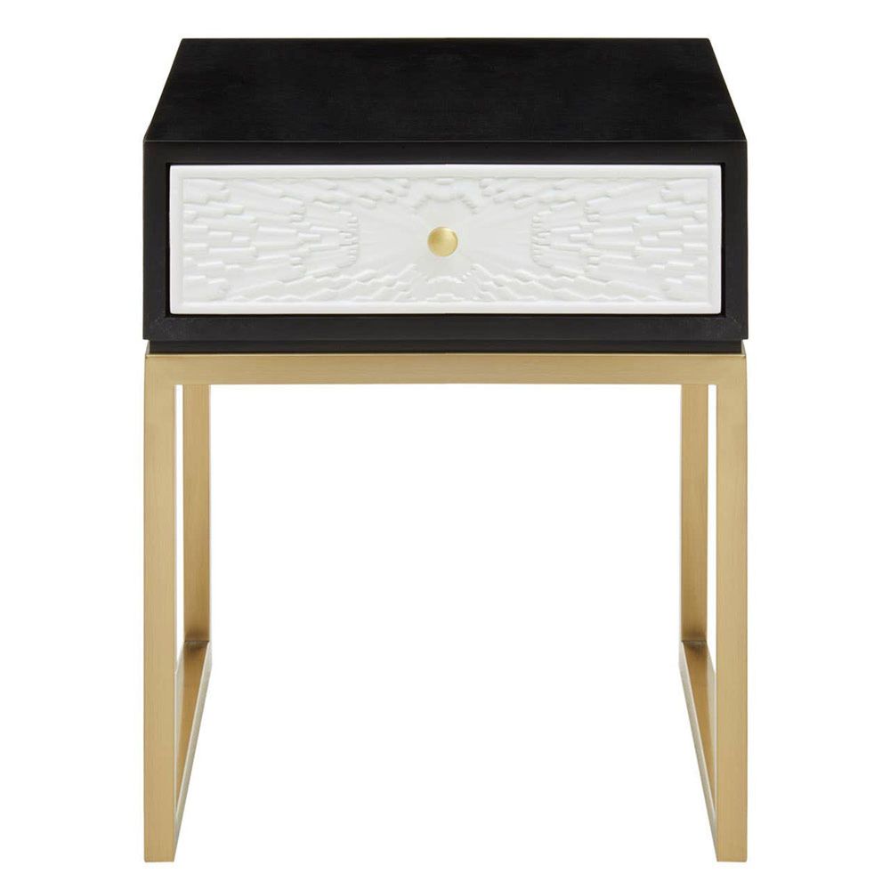 Item Code: 5527810 The Dumas contemporary side table has a clean structure and a monochromatic design with a textured pattern.This modern side table features a striking contrast of materials and textures. It has a smooth, black top and a single drawer with a white, textured front. The drawer is accented with a gold knob, and the table is supported by sleek, minimalist gold metal legs.