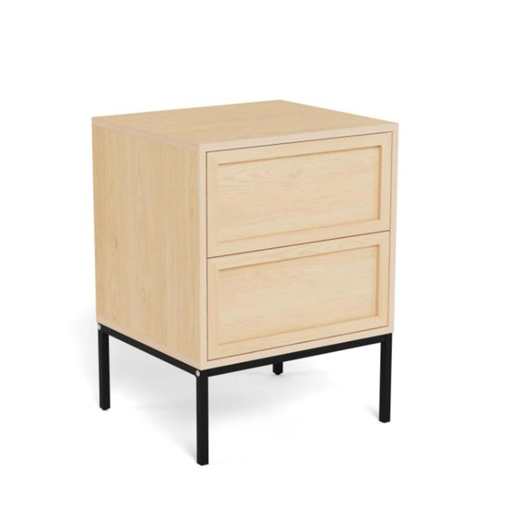 Item Code: 114131 Palmdale rectangular bedside table, top, frame and 2 drawers matt wild oak rough melamine, base matt black rough powder coated steel with push to open function.Free Delivery