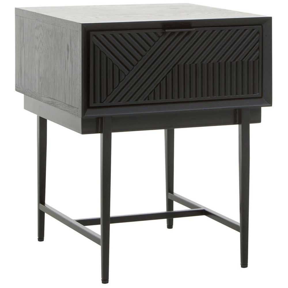 Item Code: 5528066 Combining style and simplicity, this one drawer side table with easy to pull cutout handle, helps combat clutter.This side table has a carved effect wood outer that accentuates a sense of texture with the abstract pattern. Black finish metal legs contribute to minimalism while they complement the understated top.