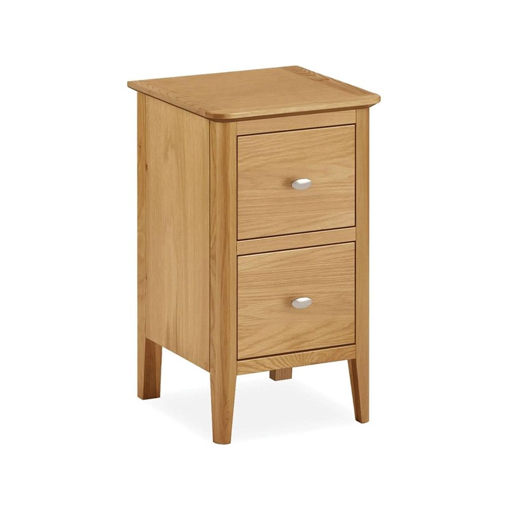 Perfect for compact spaces, the Bath Oak 2 Drawer Narrow Bedside Cabinet combines timeless style with everyday functionality. Crafted from pale oak and finished with a light lacquer, the natural beauty of the wood grain is enhanced, while the contemporary tapered legs and rounded edges bring a refined finish to the design.