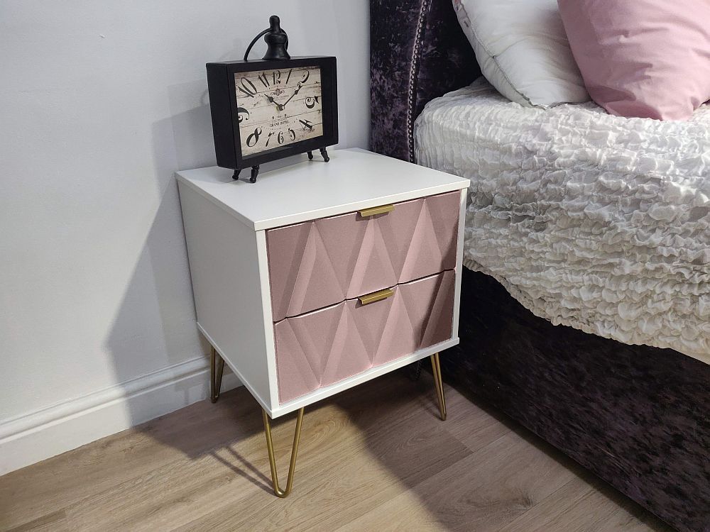 Diamond Pink and White 2 Drawer Bedside Cabinet with Gold Hairpin Legs
