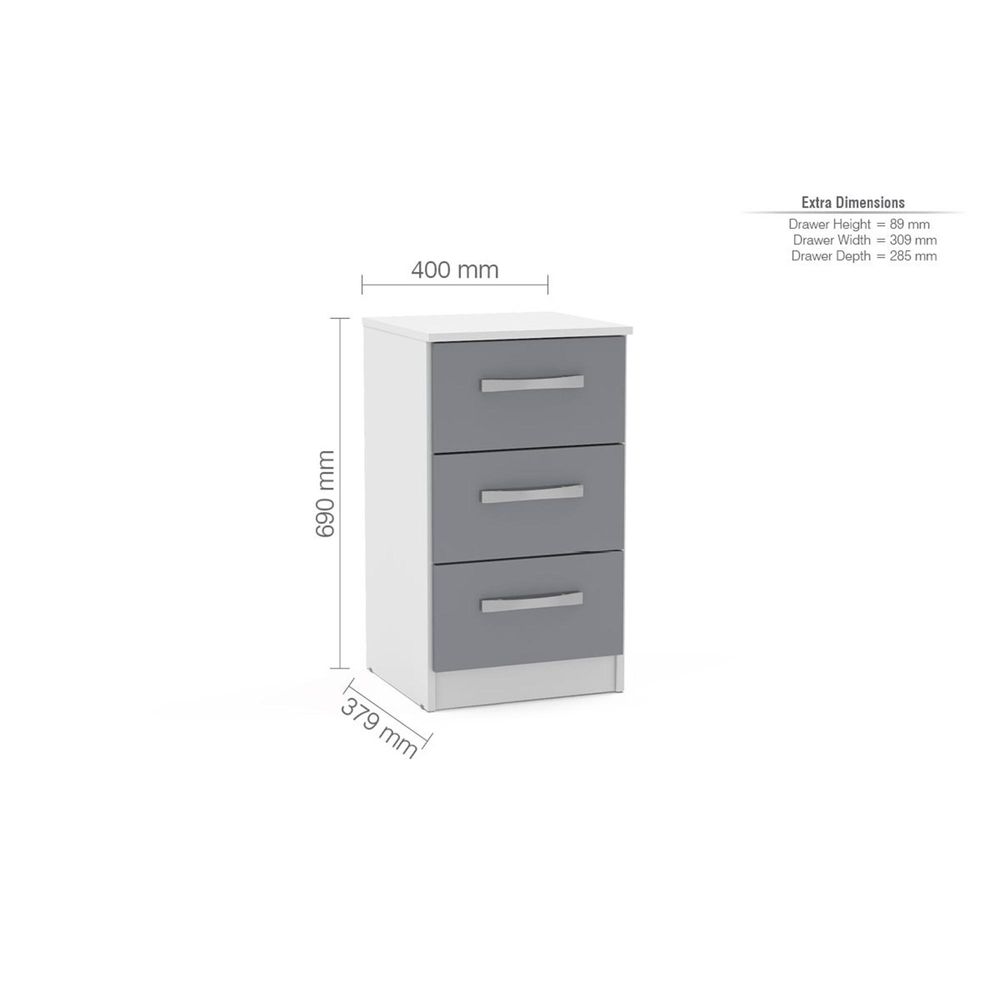 Lynx Bedside Cabinet - 3 Drawer - White and Grey Gloss
