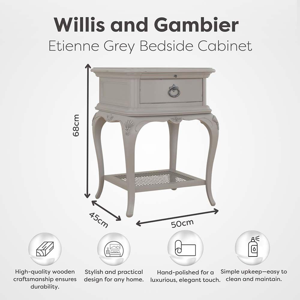 Choose the Willis and Gambier Etienne Grey 1 Drawer Bedside Table for its graceful design, practical storage, and enduring craftsmanship. Whether styled alone or paired with matching pieces from the Etienne Grey collection, it’s a charming and functional addition to your bedroom.