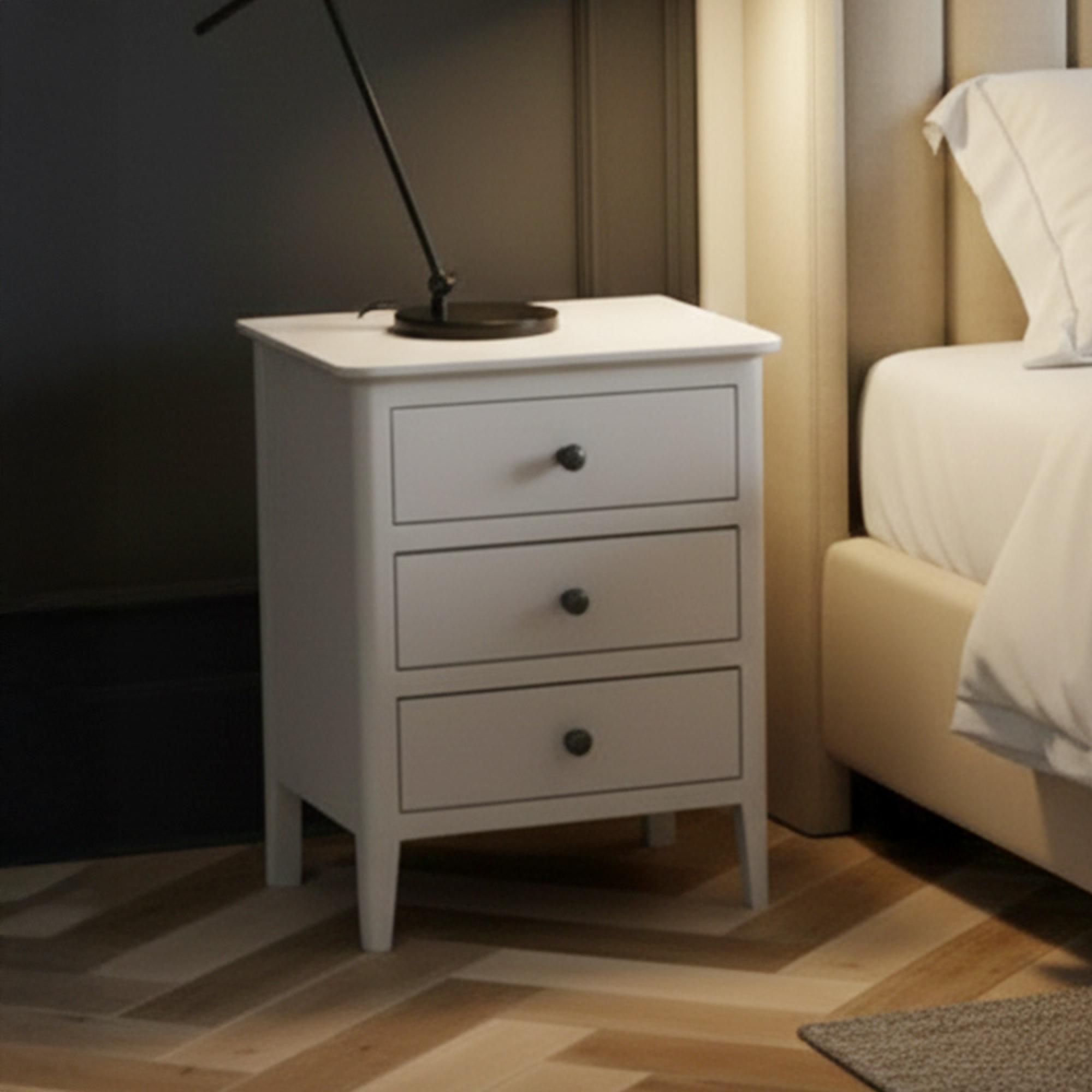 Made from solid pine wood and finished in a light grey lacquer, this cabinet is built to last while maintaining a soft, sophisticated aesthetic. With three drawers, it provides ample space for organising bedtime essentials, books, or personal items. The drawers are fitted with stylish gunmetal grey knobs, adding a subtle contemporary touch to its refined design.