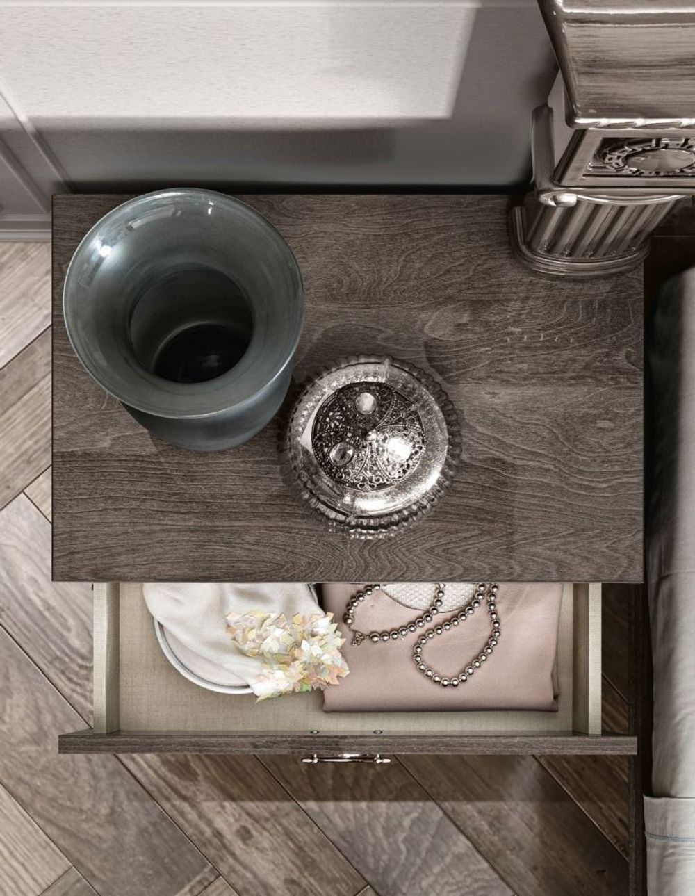 Item Code: 166CMN.01PL This bedroom with strong glamour accents is modernised by the clean, essential lines of the night table and dresser. The grey and silver striped 1.5 mm edging is the elegant detail on the 30 mm thick tops. The insert, which follows the arched line of the headboard, revives the nickel profile motif and enhances the shining look of the bedroom. The lacquered finish of the Nabucco headboard, footboard and mirror is the result of the high level of manual craftsmanship which reproduces the silver hues and charming chromatics of the birch finish.The special handles in a glossy silver finish emphasise the glamour of the Nabucco bedroom. The look is then softened and made contemporary by the grey and silver striped edging.This is a Made to Order itemAll Made to Order items are manufactured as per the order supplied by you.We are unable to accept cancellation or accept any extra cost that may incur due to wrong information provided by you at the time you placed the order.We will confirm all sizes/colours/finishes in written email (order confirmation) with you before going ahead with production of your order.