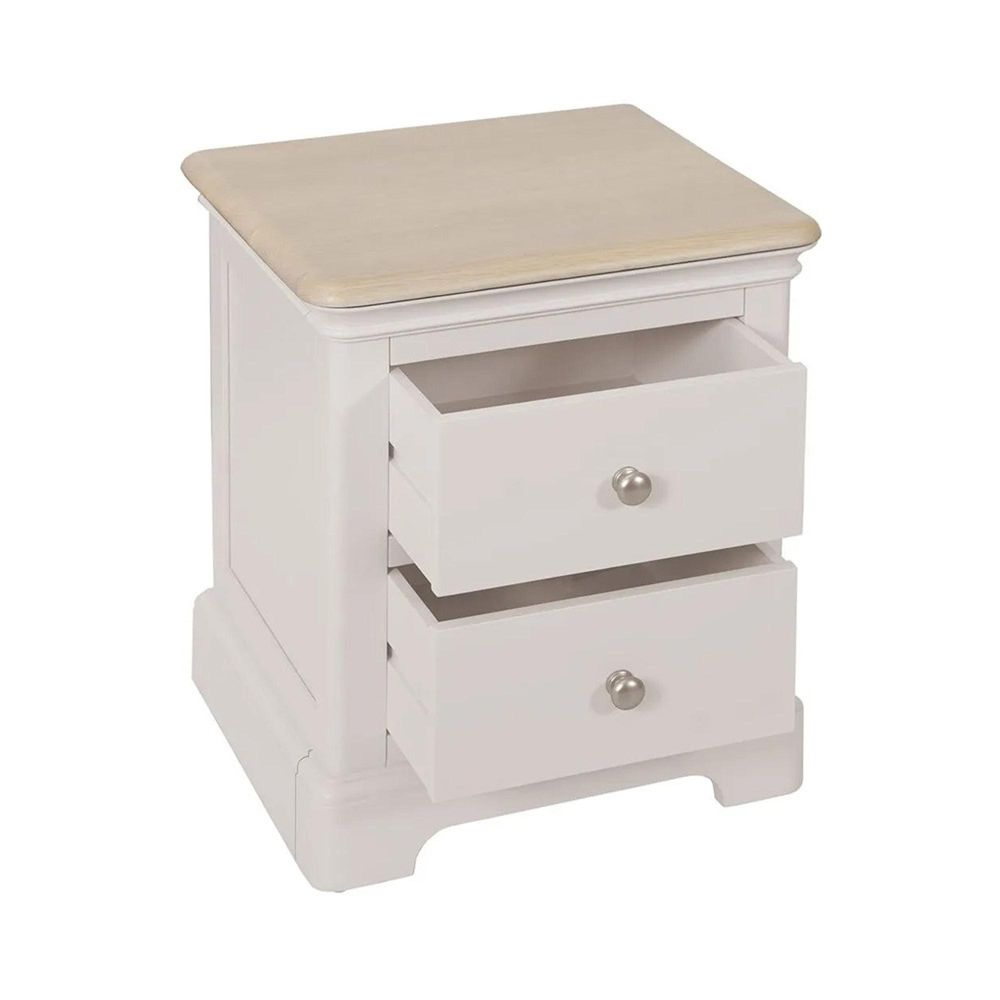 The Cromwell Grey Painted 2 Drawer Bedside Cabinet is a practical yet stylish addition to any bedroom, designed with the same attention to detail and craftsmanship as the rest of the Cromwell collection. With its neutral light grey painted finish and lightly lacquered oak top, this piece strikes the perfect balance between modern minimalism and timeless elegance.