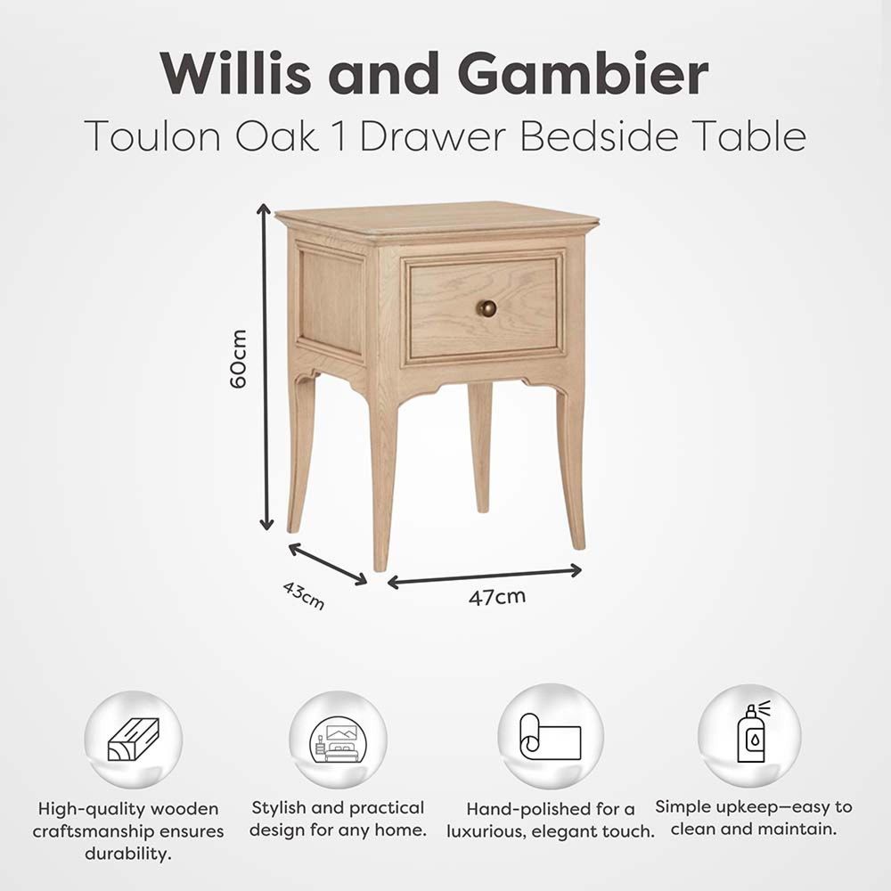 The Willis and Gambier Toulon Oak 1 Drawer Bedside Table is more than just a piece of furniture—it is a statement of craftsmanship and elegance. Choose this table to add functional style and classic sophistication to your bedroom, and enjoy a blend of luxury and practicality every day.