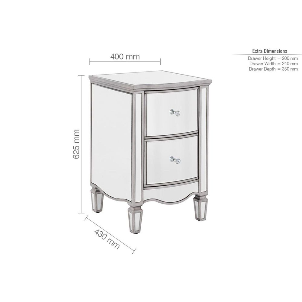 Item Code: ELY2BSMIRV2 Give your bedside a sophisticated finish with the Elysee 2 drawer bedside.Elegantly made this 2 drawer bedside table is crafted in a clean, detailed design with a beautiful glass mirrored finish to provide a sense of space and light even in the dullest of rooms.Complete with crystal handles, this Elysee bedside table features two spacious drawers with a luxurious velour lining.This versatile range will sit comfortably in a modern or traditional setting making this mirrored furniture a welcome addition to any home.Cleaning and Care: Wipe with dry cloth.