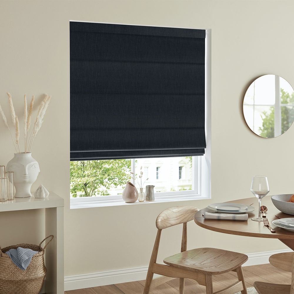 Item Code: ROMF-1006-RM This soft, textured fabric features a herringbone pattern in a pure black hue with dark grey highlights that is ideal for creating a darkened sense of stylish sophistication in any room.