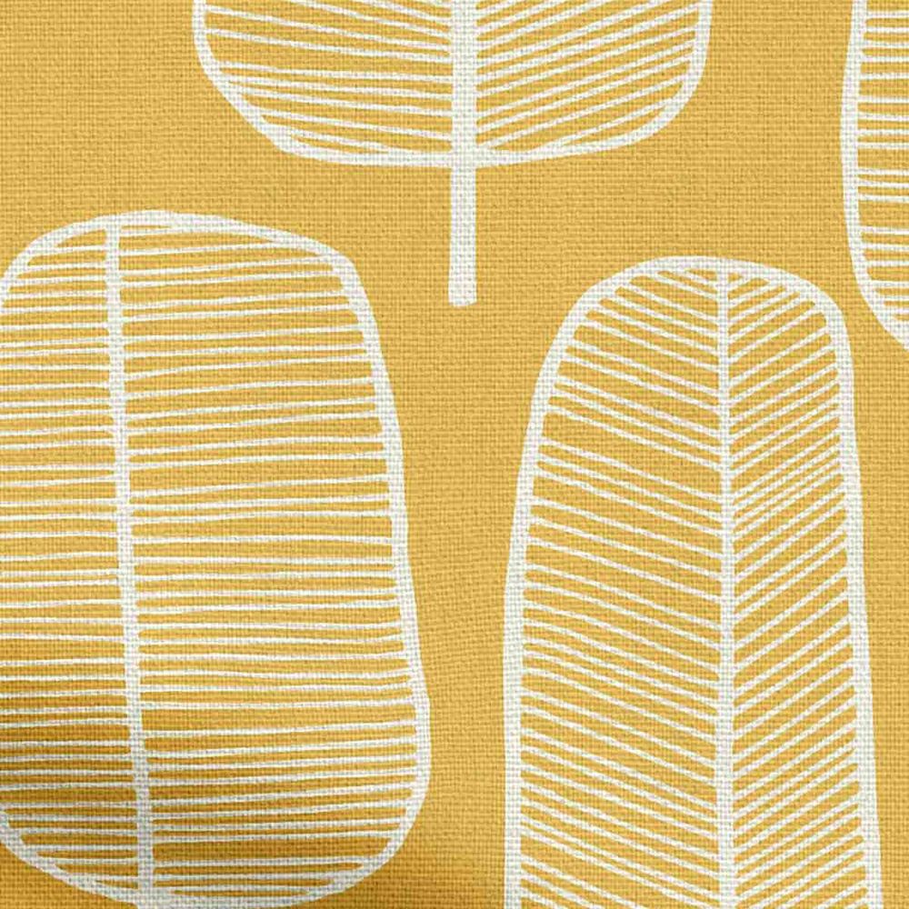 This scandi-inspired screen-printed design features sketch-book style trees of white over a zesty yellow background to create a warm and welcoming minimalistic style.