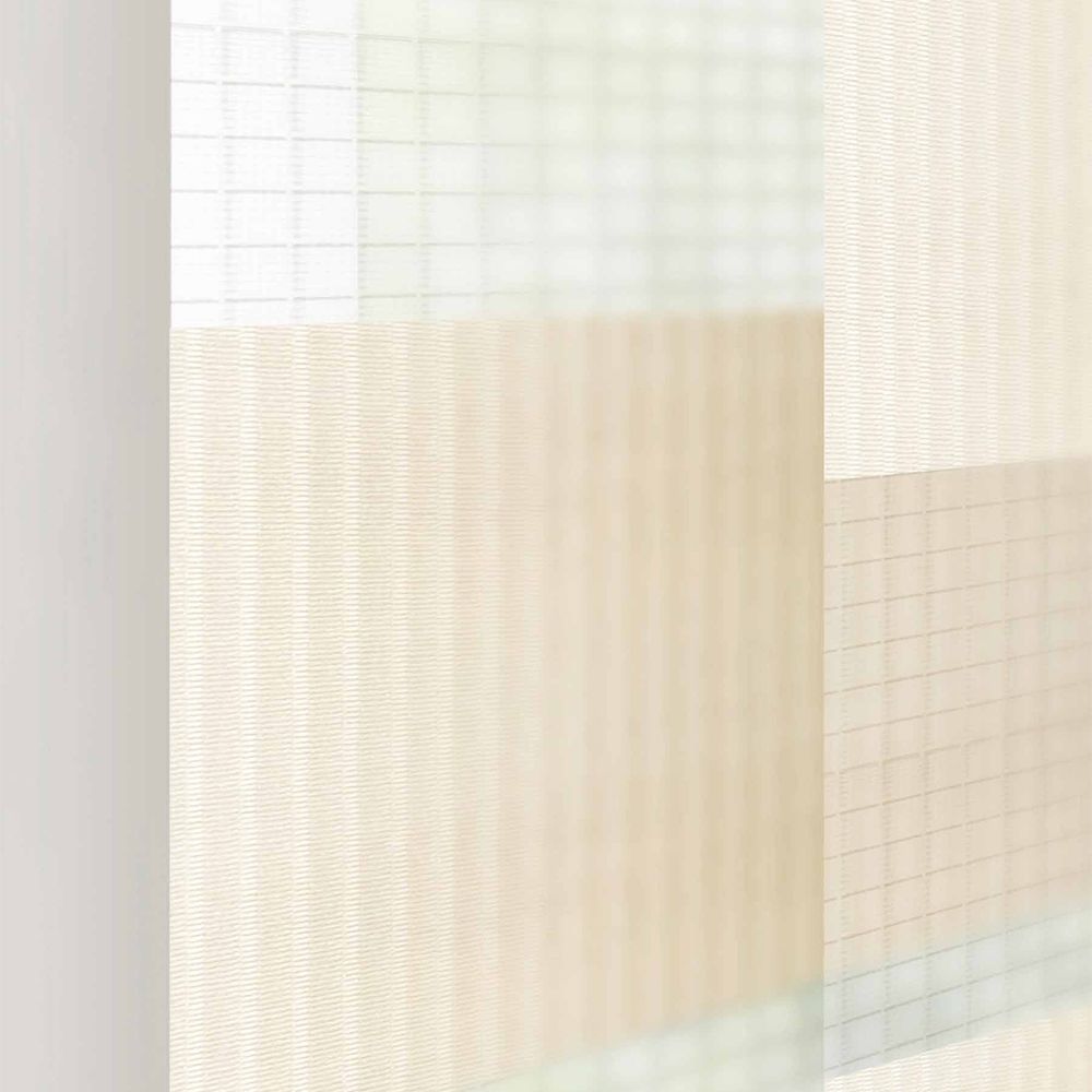 Featuring vertical light ivory stripes and net fabric with silk thread highlights, this design can create a subtle warmth in any space.