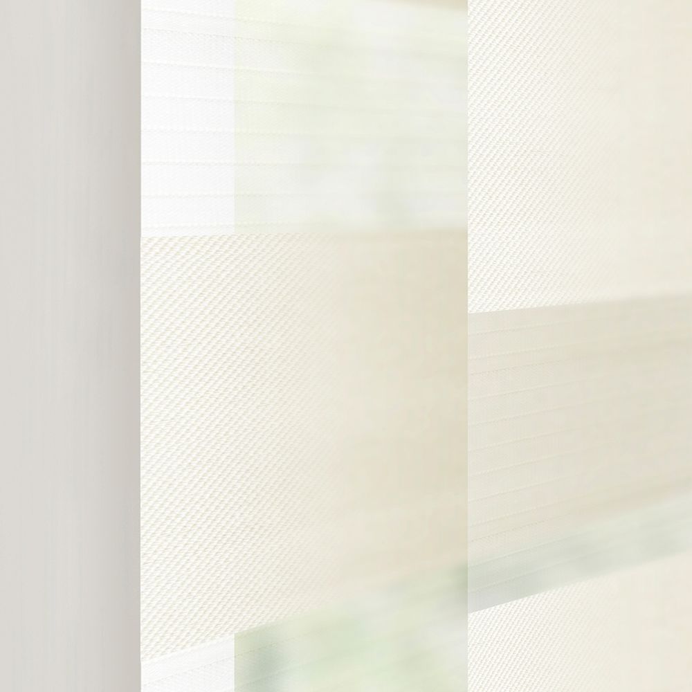 Using delicate ivory-white coloured hairline patterning alongside broad stripes of silky net fabric, this delicate design provides a clean and bright feel for any room
