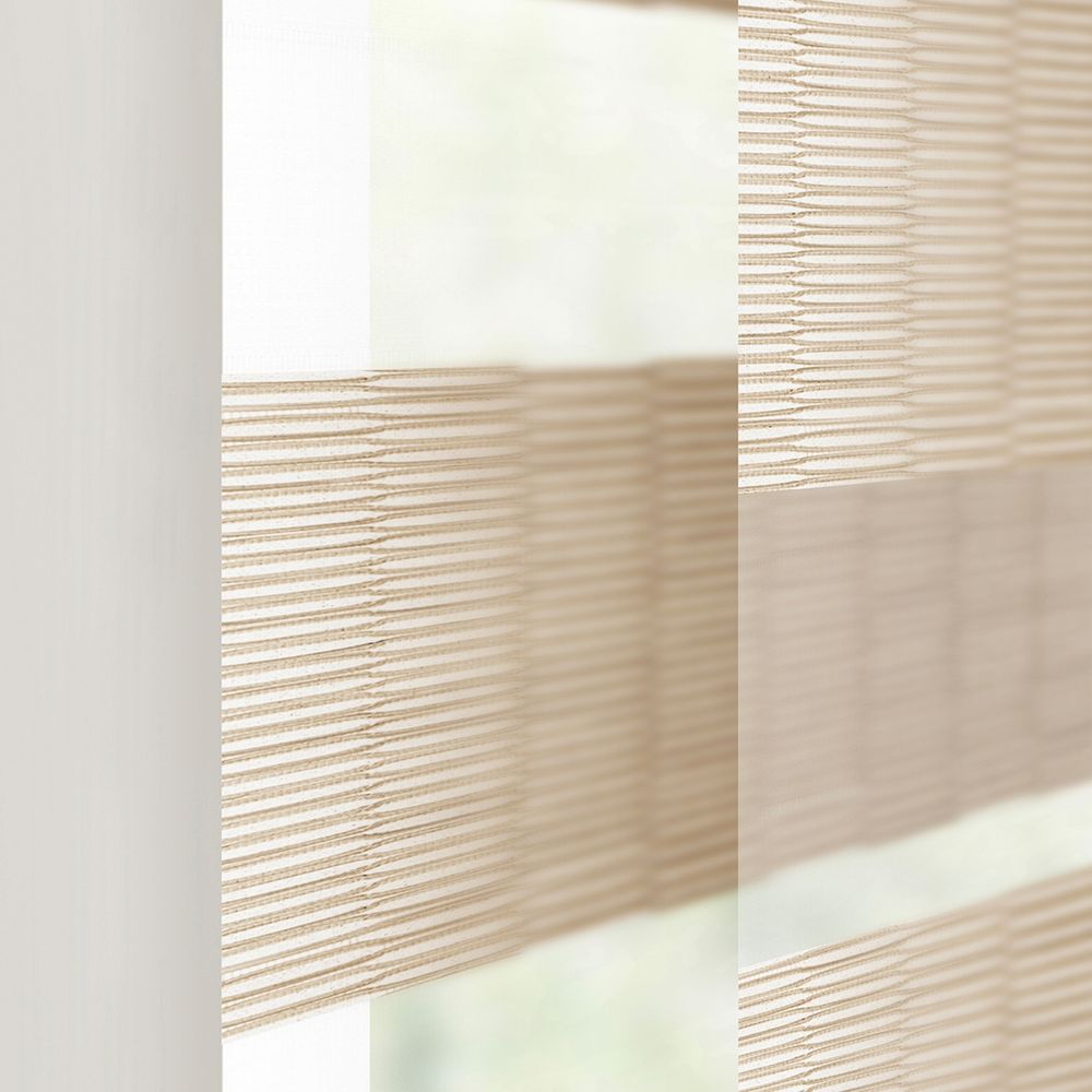 With natural light brown woven lines and an elliptical weave pattern that is mirrored throughout the fabric, this design can create a spacious and subtle warmth in any room.