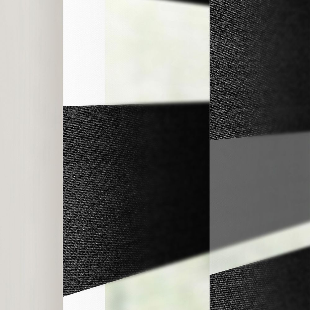 Featuring solid colour panels of mono-black alongside micro-mesh net fabrics, this design creates a sophisticated and stylish atmosphere in any room.