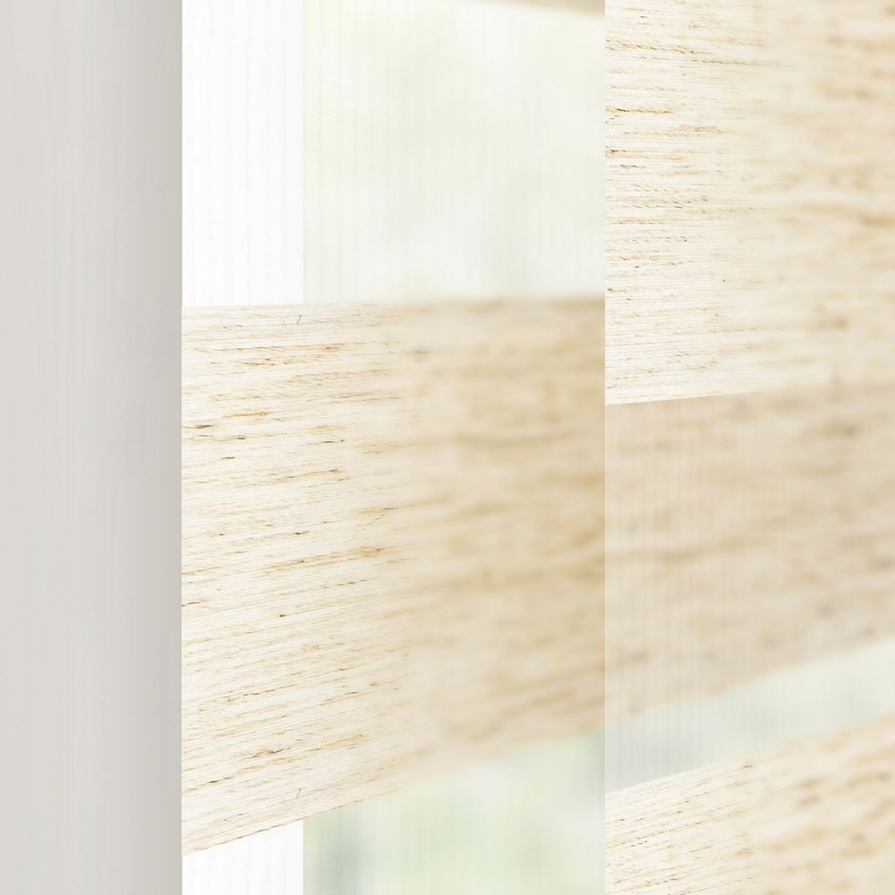 With its light-brown natural wood tones and sheer woven net, this linen fabric creates a bright and welcoming space for any room.