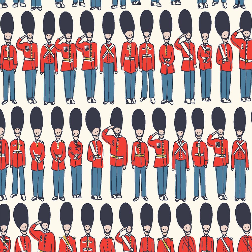 This cute London Guard pattern uses colourful red and blue tones over its white background, which is perfect for brightening your little soldiers bedroom.