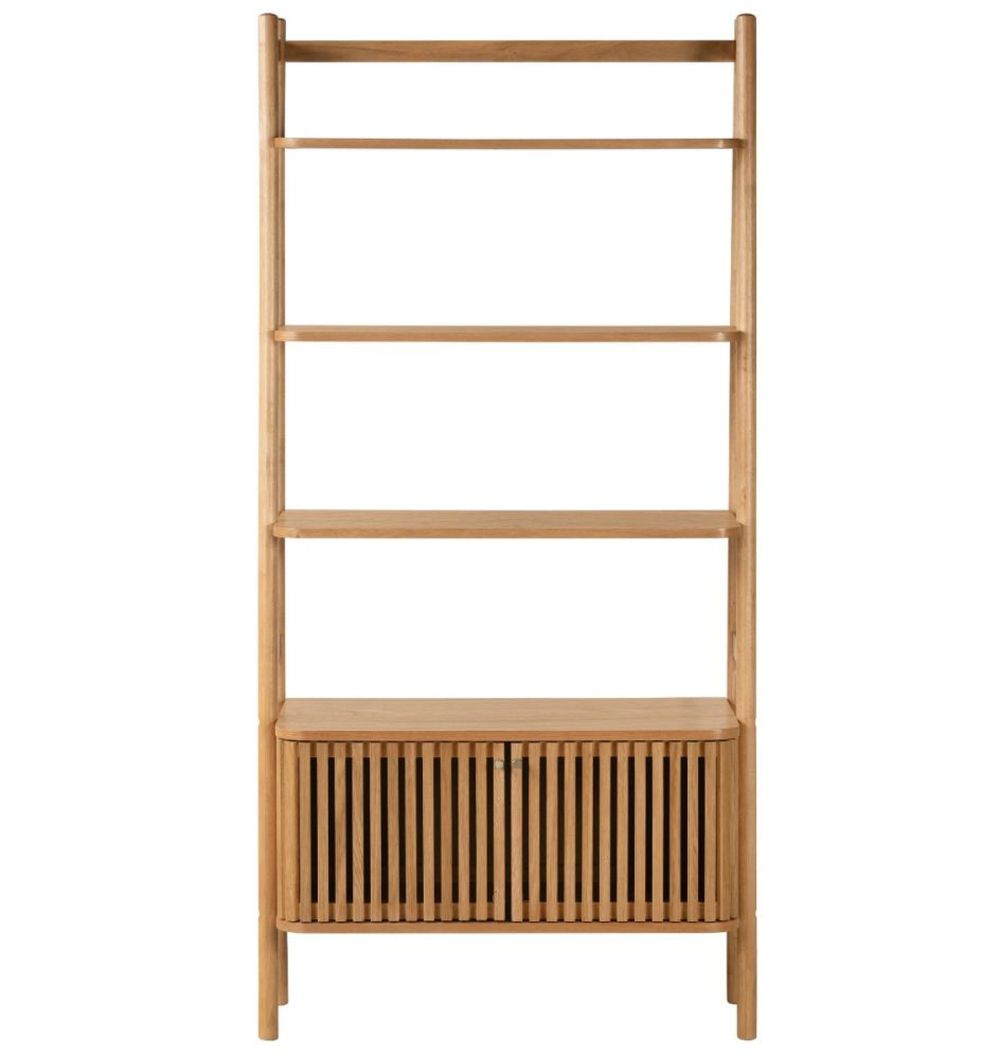 Designed for both display and organisation, the bookcase features three open shelves for books, ornaments, or decorative pieces, and two lower slatted doors that neatly conceal additional storage. Perfect for living rooms, studies, or dining spaces, it brings texture, warmth, and structure to any setting.