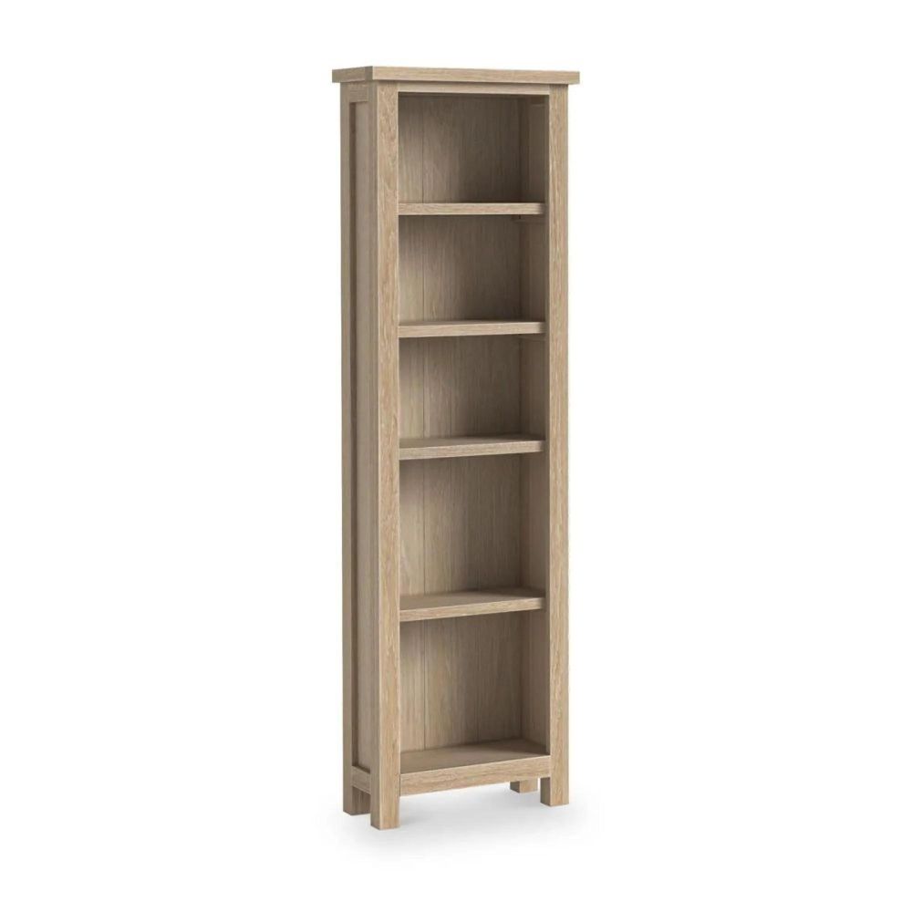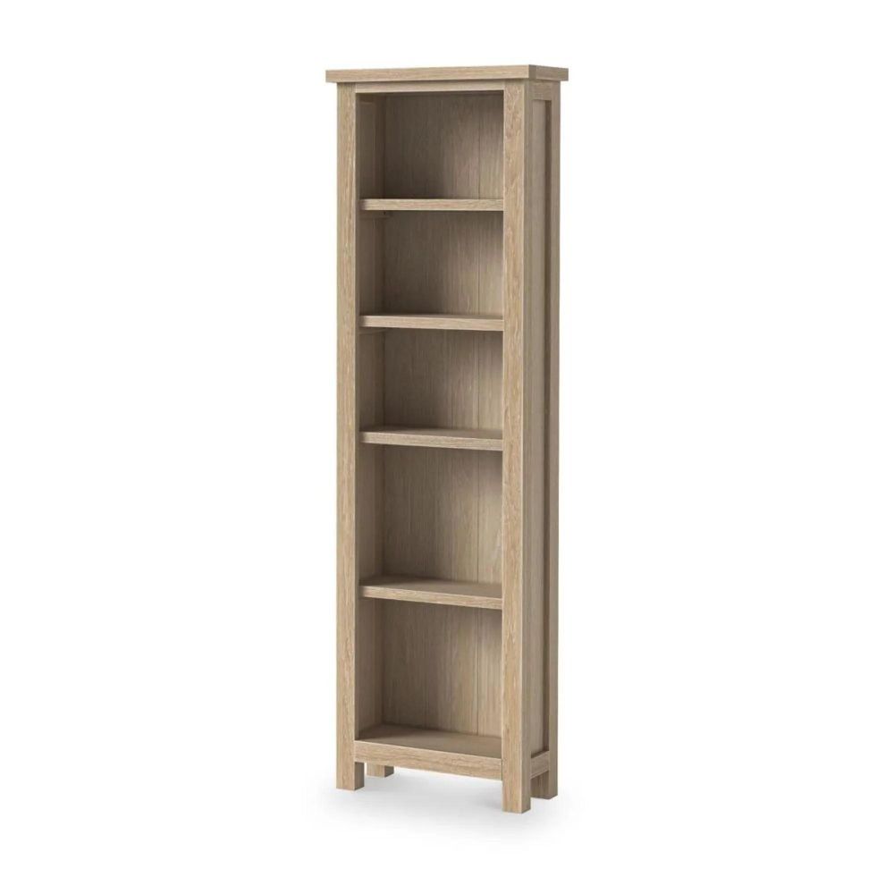 The Modern Country Oak Slim Bookcase blends timeless design with practical functionality. Crafted from premium solid wood, this piece is built to showcase your books, decorative items, and personal treasures while adding refined charm to any room. Its white-washed oak finish highlights the natural grain of the wood, reflecting the quality and craftsmanship that define this collection.