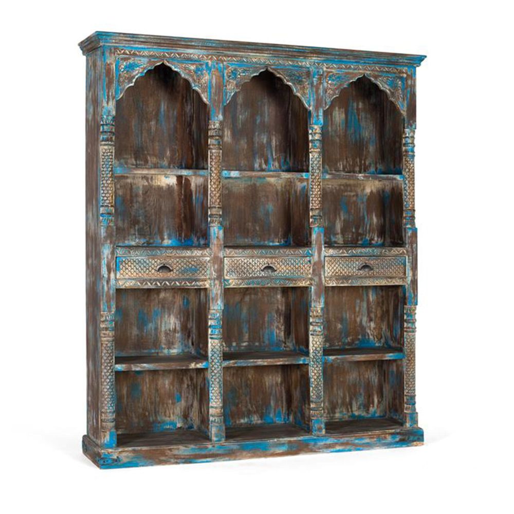Item Code: 1833 This exotic style bookcase is a stunning piece of furniture, carefully hand carved and painted in a charming antique blue colour. The wood, worked with meticulous craftsmanship, features intricate patterns and details that evoke a sense of adventure and mysticism, characteristic of exotic designs.The antique blue finish adds depth and visual history to the bookcase, giving it an antique look and full of character. This finish highlights the detailed carvings, making each design even more prominent and eye-catching.In addition to the 3 drawers, the bookcase offers spacious shelves, ideal for displaying books, decorative objects and special keepsakes.