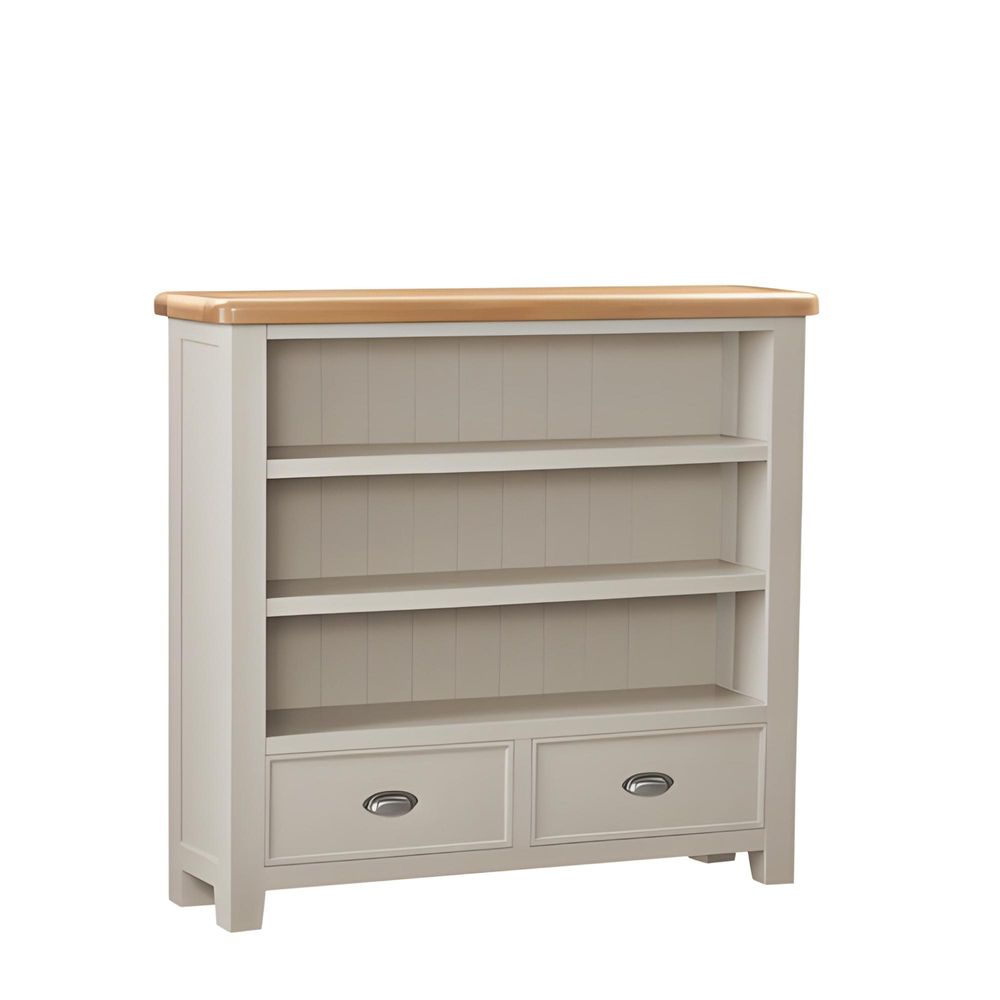 Item Code: 170-15 The Janelle Painted Low Bookcase, the base is painted in light gray, the top is a warm, rustic oak finish, smooth rounded corners, retro cup handles and panelling which gives the range a traditional appeal for the modern home.Free Delivery