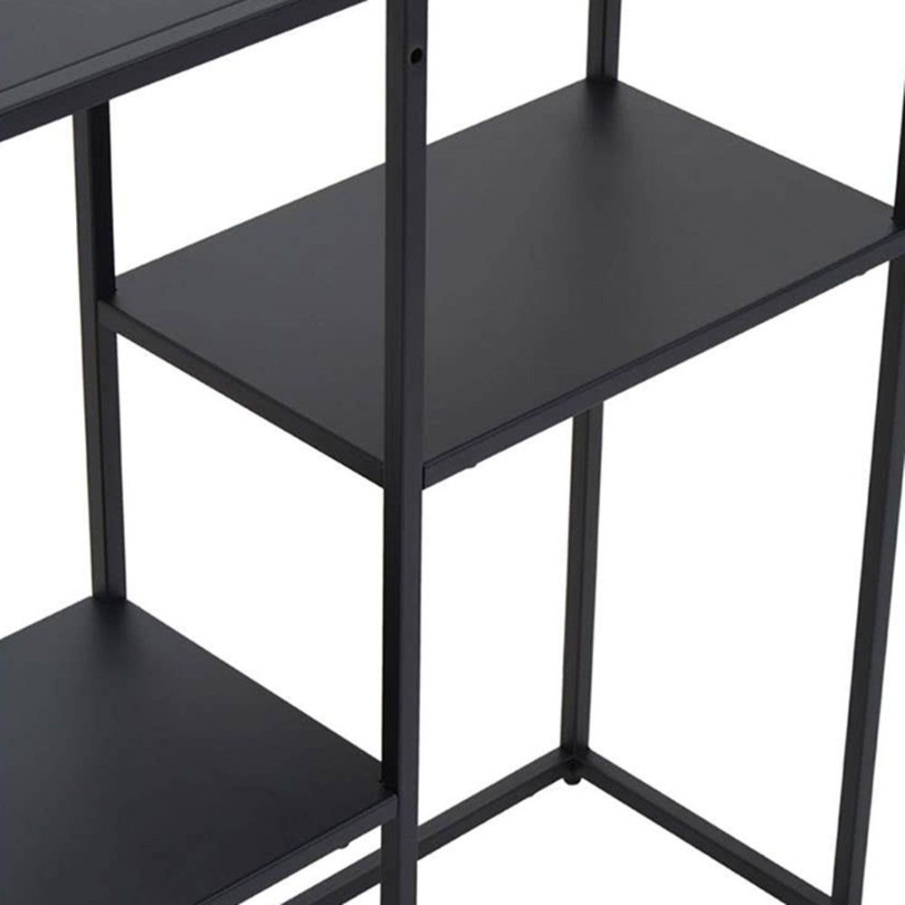 Item Code: 2406609 The Acero black metal shelf unit offers stylish shelving to display or organise home accessories and will work with a variety of interiors.This multi shelf unit offers the versatility of putting things on display within easy reach. Made from black powder coated metal, the sturdy design has clean and minimal lines which combine to create openwork, with lower shelves adjusted at different levels.