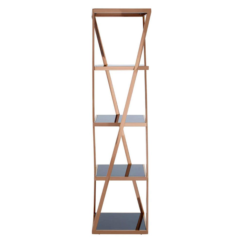 Item Code: 2405430 The unique design of the Ackley shelf unit lends it to contemporary luxe interior settings.The Ackley shelf unit is comprised of five square shelves, tiered to create a tall statement piece. Each shelf is made from tempered glass and has a sleek black finish, counterpointing the warm metallic frame. The stylish rose gold finished frame features a distinctive angular design that creates the illusion of the frame being twisted.Free DeliveryDelivery & Service Highlights: