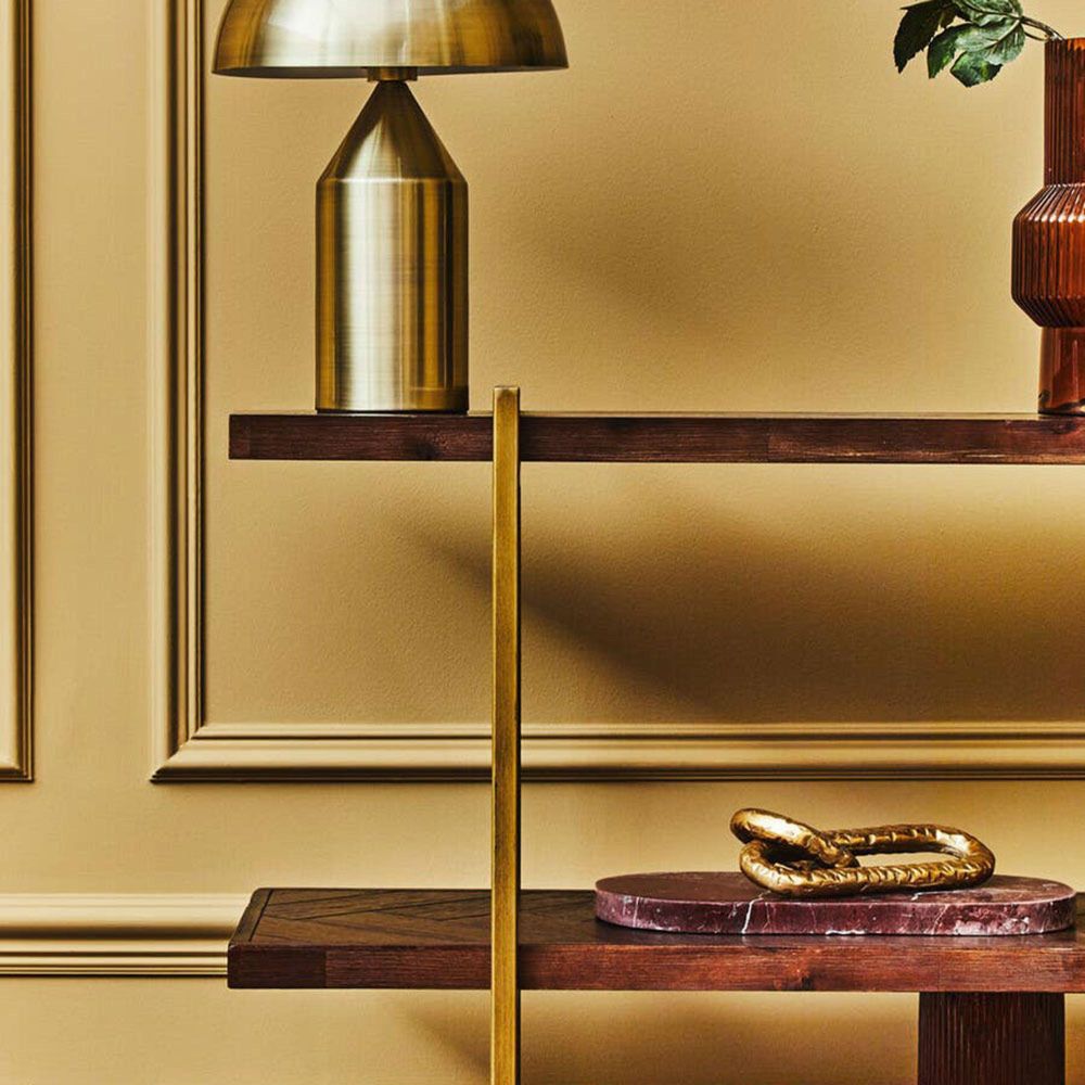 Item Code: 2405039 The Brando 4-tier shelving unit features wooden shelves with a patterned design and a sleek gold metal frame, perfect for displaying books, decor, or plants. This 4-tier shelving unit combines style and practicality. The wooden shelves feature a stylish pattern, offering a beautiful surface for displaying items, while the gold metal frame adds a modern touch. Perfect for storing books, plants, or decorative pieces.