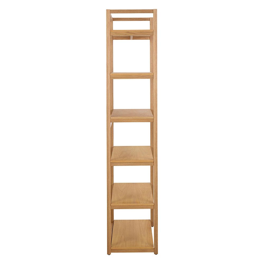 Item Code: 108860 Ludza rectangular bookcase, frame, 6 shelves and base oak oiled veneer with straight grain. Defined by clean lines and sturdy form in an oiled oak veneer, the mid-century silhouette of this bookcase is undeniable. With 6 shelves and a natural appeal, this open bookcase enhances your curated book collection and other collectibles. Its subtle 1960s style brings a retro charm to the living room and home office.Free Delivery