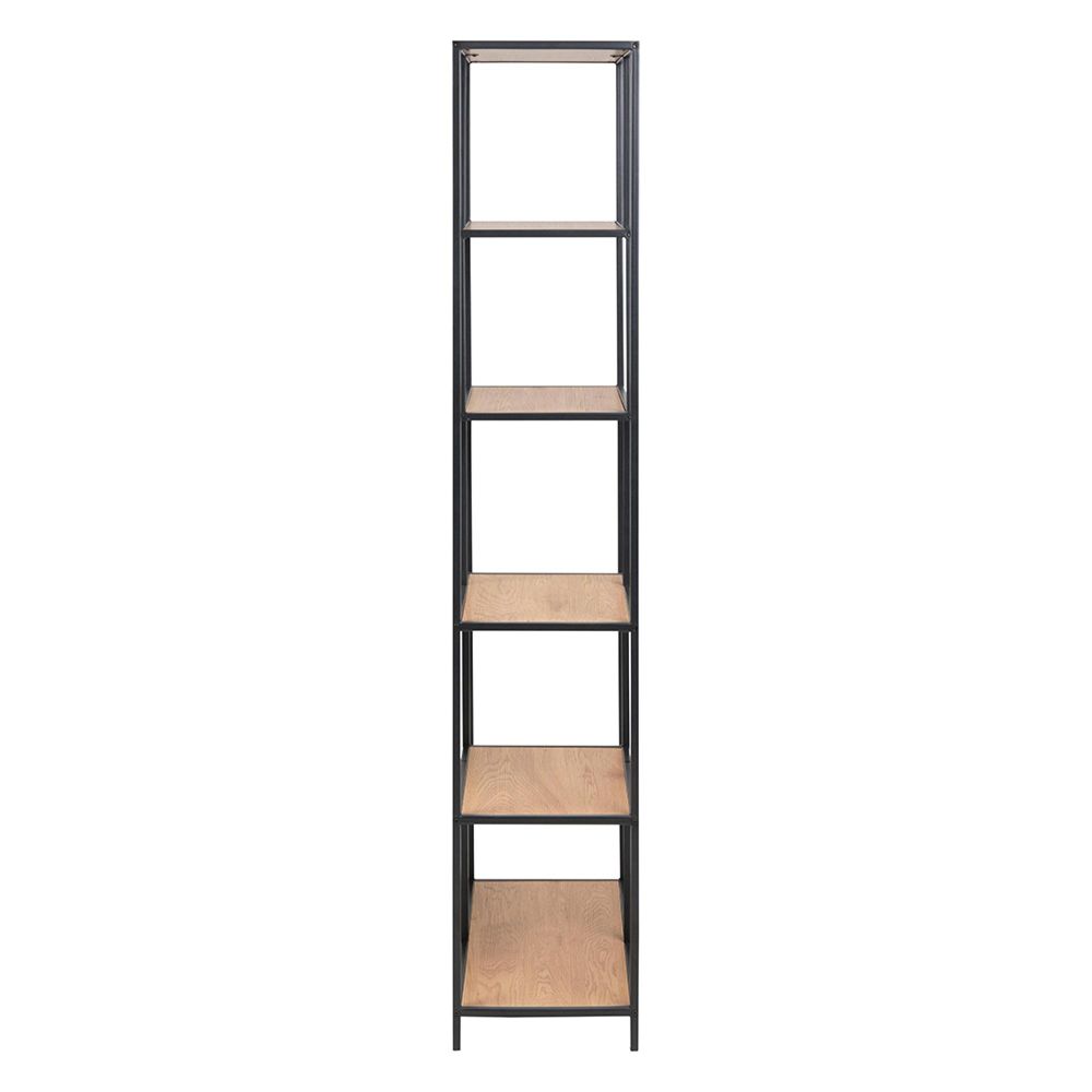 Item Code: 74548 Seaford bookcase, frame and base matt black rough powder coated steel, 5 shelves matt wild oak rough paper with asymmetrical detail. The bookcase of carefully selected materials is easy to maintain. With exclusive design rights this bookcase is the perfect accent to finish out a room with style. The piece has the personality to blend with many styles of decor featuring a striking wood effect and supported by a metal base with a powder coated appearance.Free Delivery